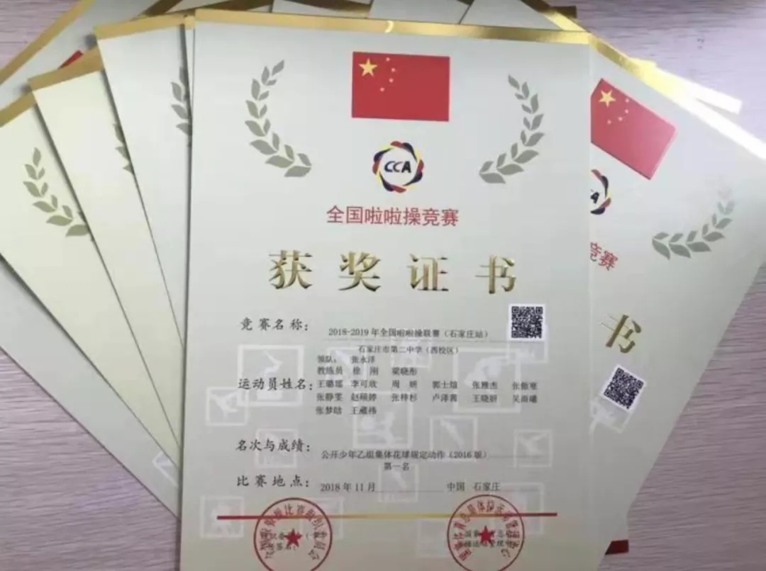 2018年11月2日-4日,在石家庄市鹿泉区“西部长青”,由国家体育总局体操运动管理中心、石家庄市鹿泉区共同举办的2018年全国啦啦操联赛(石家庄赛区)开赛。我校“耀眼之星”啦啦操队共派出14名队员参加比赛。她们参加了公开少年乙组(12-16岁)的啦啦操规定动作项目和自选动作项目的角逐,并获得这两项比赛第一名的好成绩。