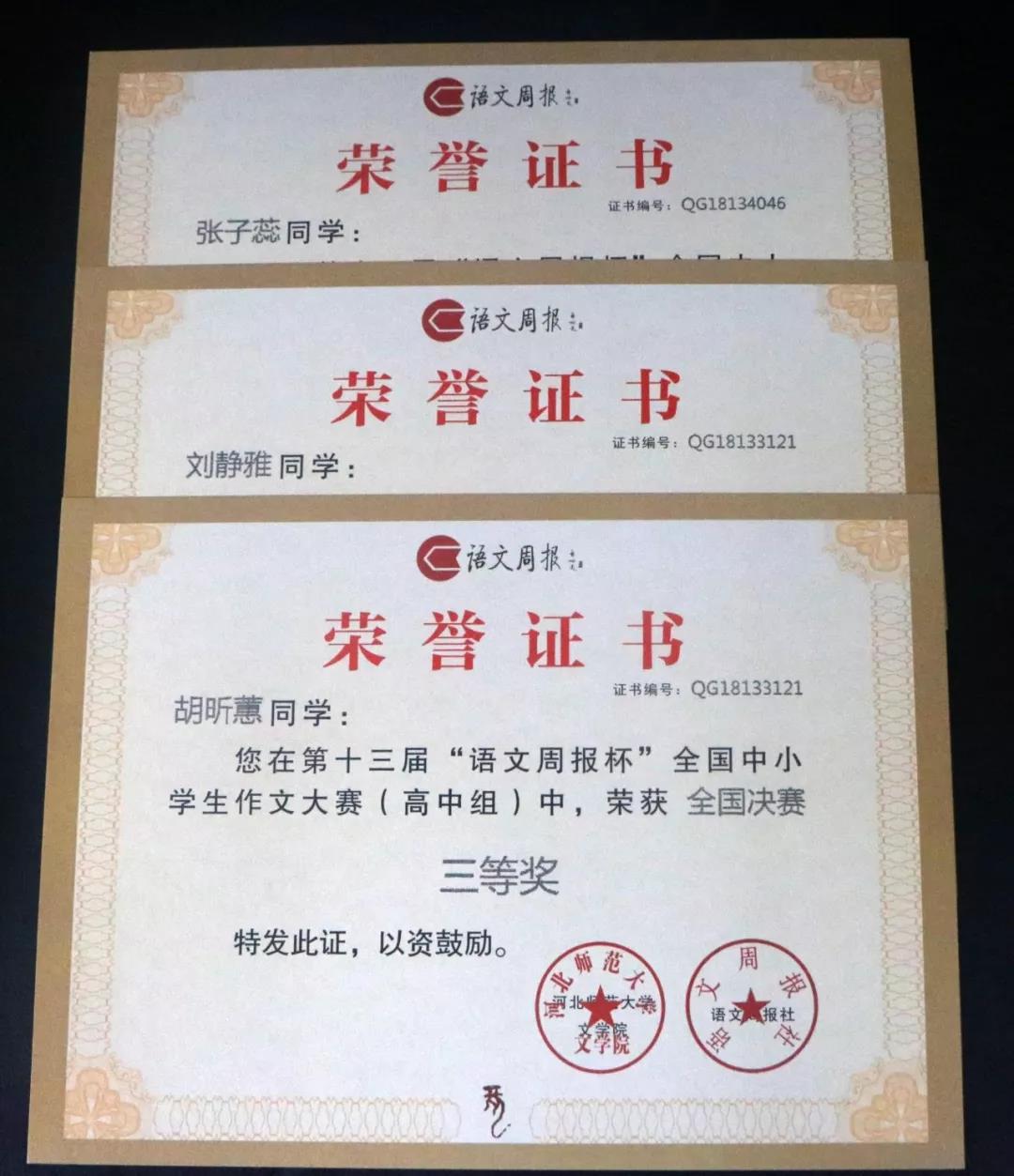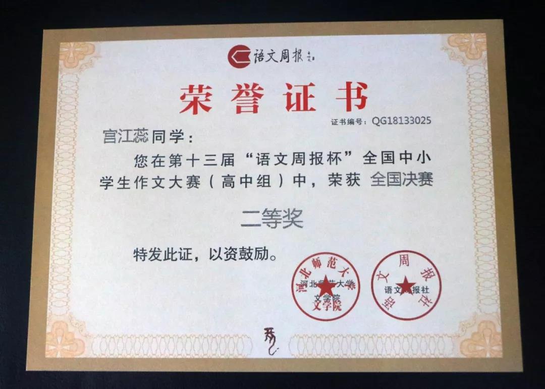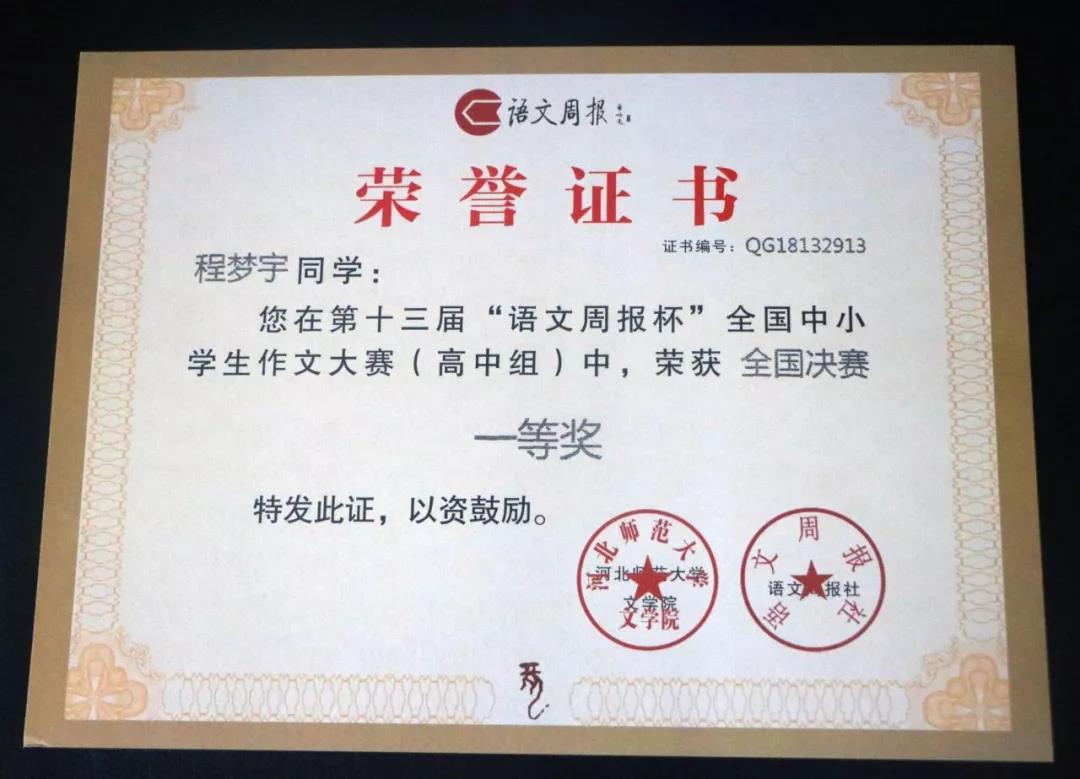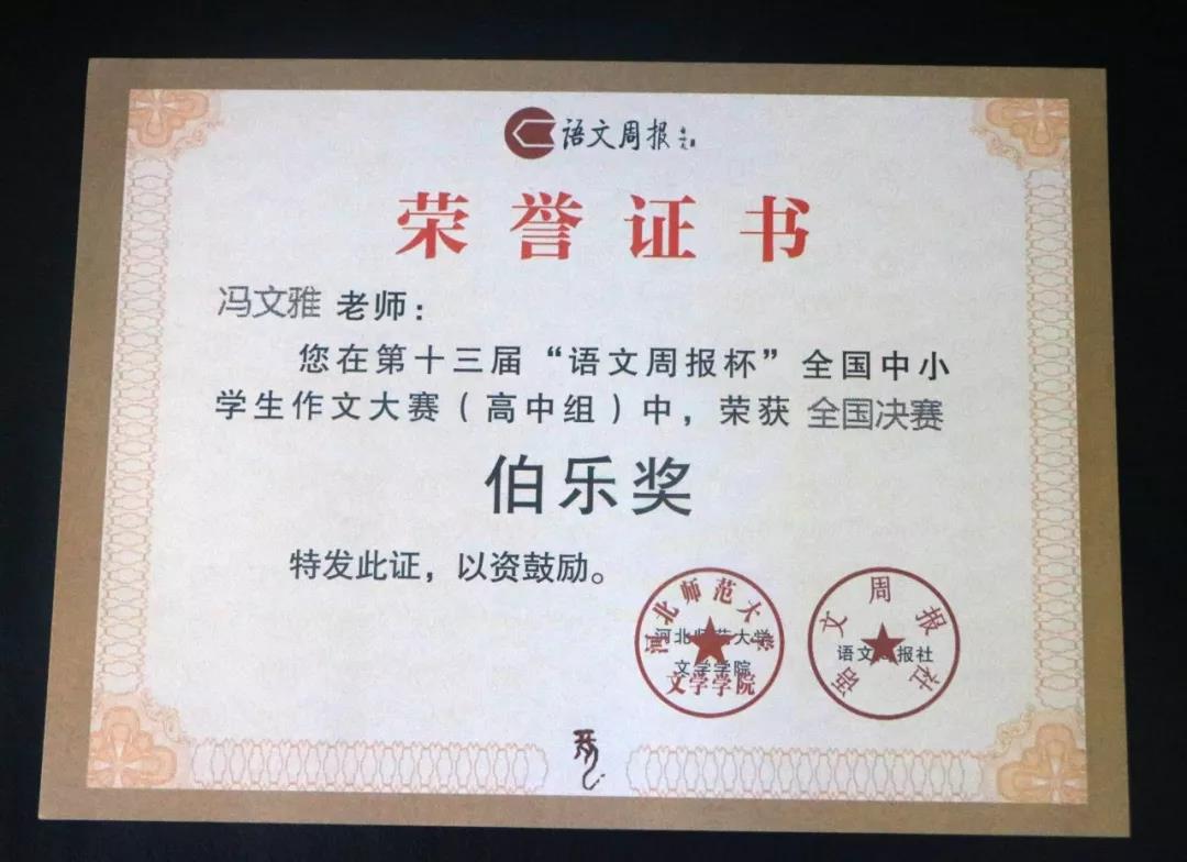 我校语文组重视对学生写作能力的培养,引导学生关注社会现实,立足优秀传统文化,培养敏锐的审美与表达能力。此前,在“语文周报”杯的作文比赛中,程梦宇同学获得一等奖,宫江蕊同学获得二等奖, 胡昕蕙、刘静雅、张子蕊等同学获得三等奖,冯文雅老师获得伯乐奖。