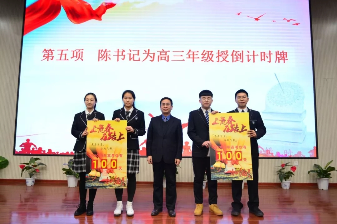 学校党总支书记陈怀彦给高三学生代表授予倒计时牌后,各班同学进行宣誓,发誓要珍惜时间,努力拼搏,奋战百天,决胜高考。最后,吴进校校长发表了重要讲话。他用生动形象的语言告诉大家,高考对于人生的重要性,并激励大家要坚定信念,决战高考,冲进名校,为实现中华民族的伟大复兴而努力学习。最后,大会在全体师生和家长们的集体宣誓中落下帷幕。