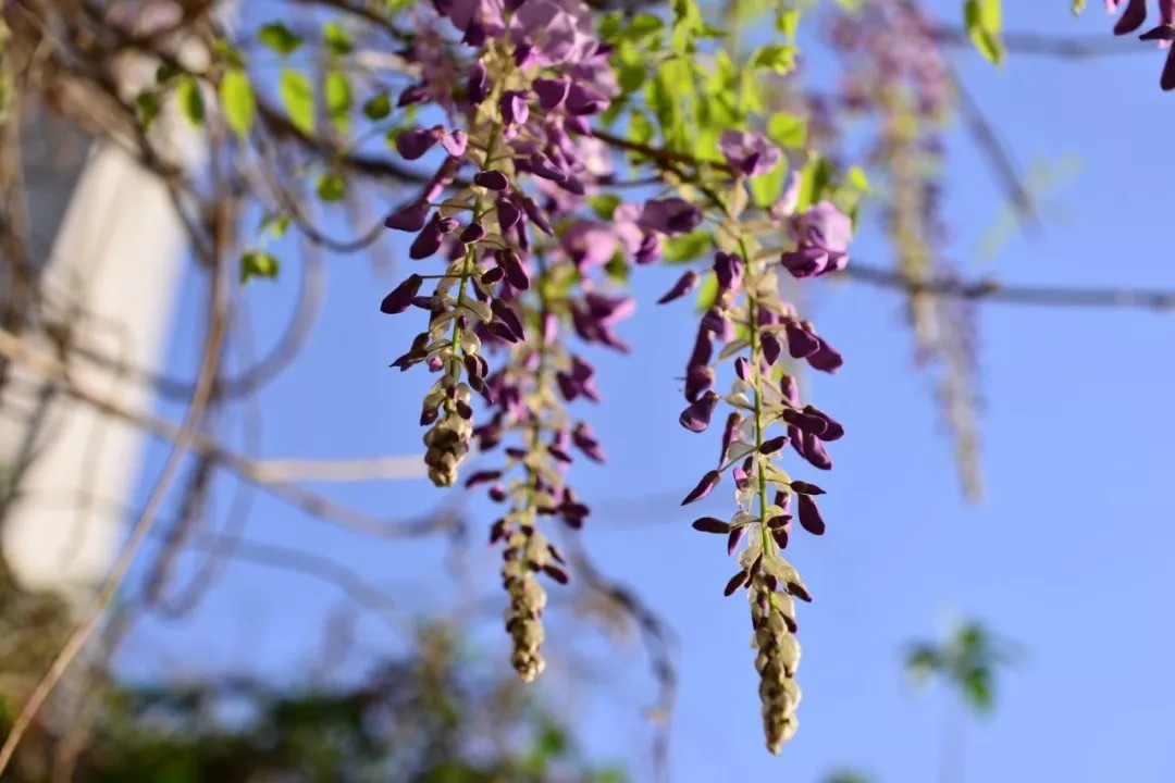 正是紫藤吐艳之时,但见一串串硕大的花穗垂挂枝头,紫中带蓝,灿若云霞。灰褐色的枝蔓如龙蛇般蜿蜒。