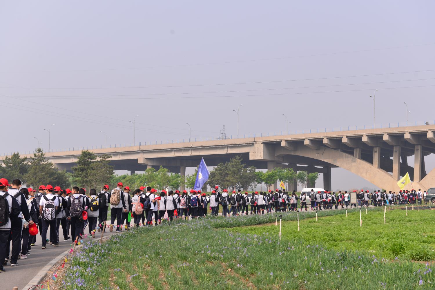 在晨曦中,高一、高二学生集合出发。经过半个小时的车程,全体学生抵达本次远足活动的起点滹沱河畔、南水北调流经处,领略这个新中国战略工程的伟大。
