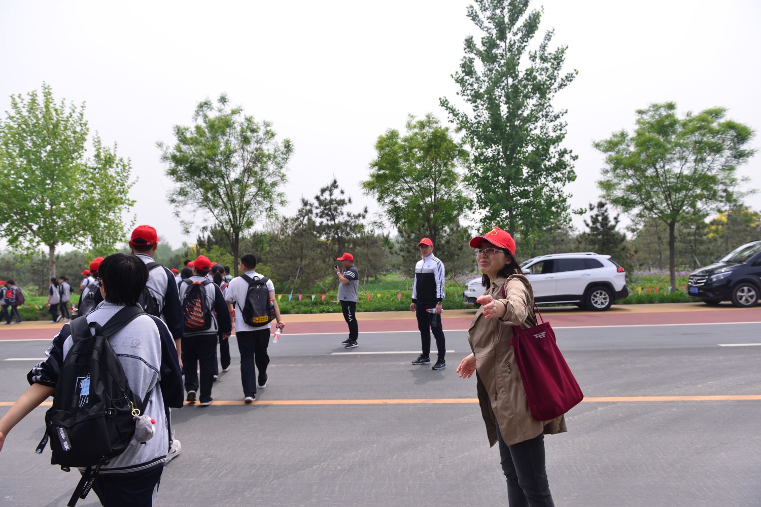 在活动中,吴进校校长、樊茹副校长、查利主席走在队伍的最前面;各位处室主任、年级主任、随行老师跑前跑后,传信、调度、组织队伍;家长志愿者更是自始至终守护在孩子们周围,保障了路途的安全。不少同学脚也磨破了,但队伍始终整整齐齐,没有一个人掉队。同学们克服困难、互帮互助,脸上荡漾着灿烂的笑容,健步如飞,一路歌声嘹亮,欢声笑语不断。