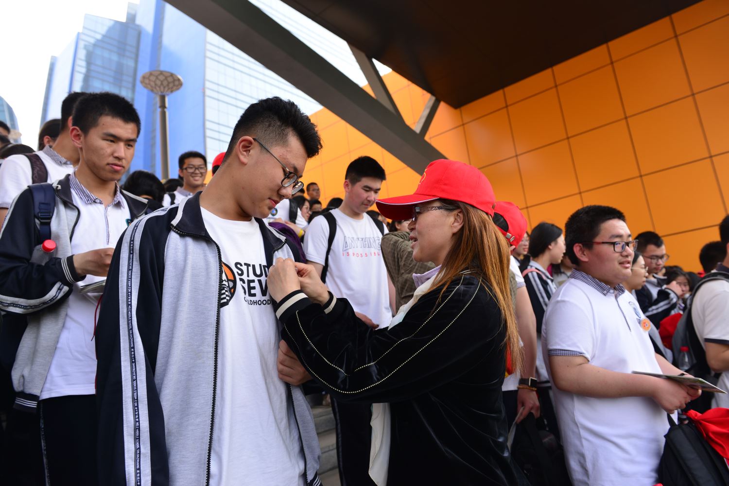 家长志愿者为同学们佩戴徽章