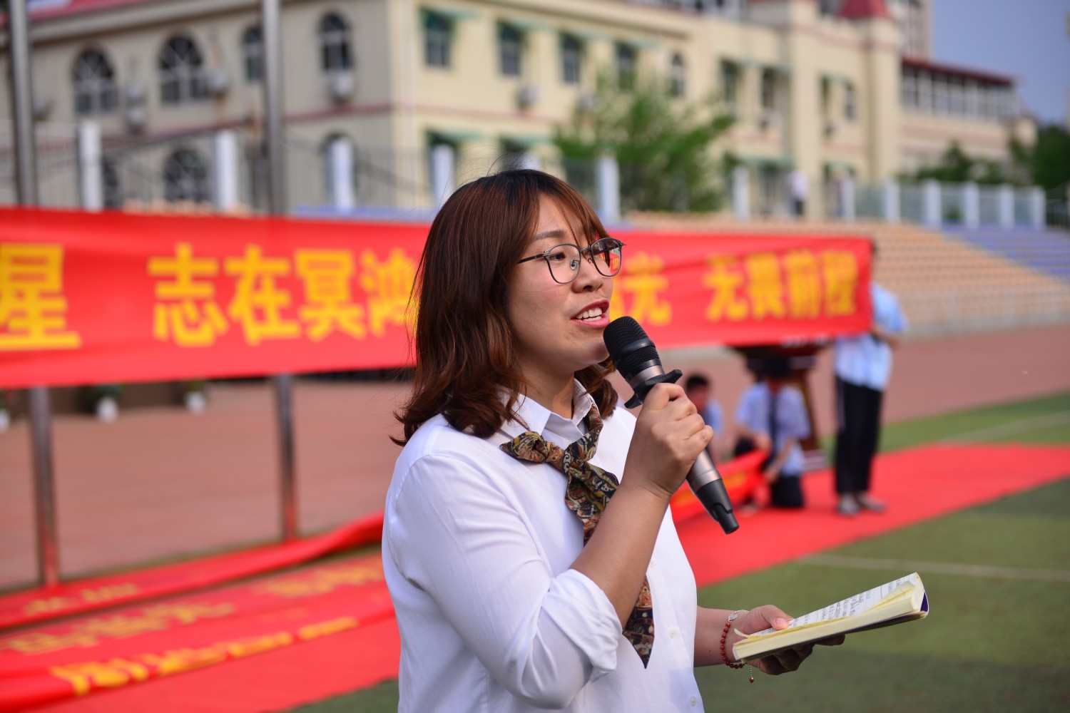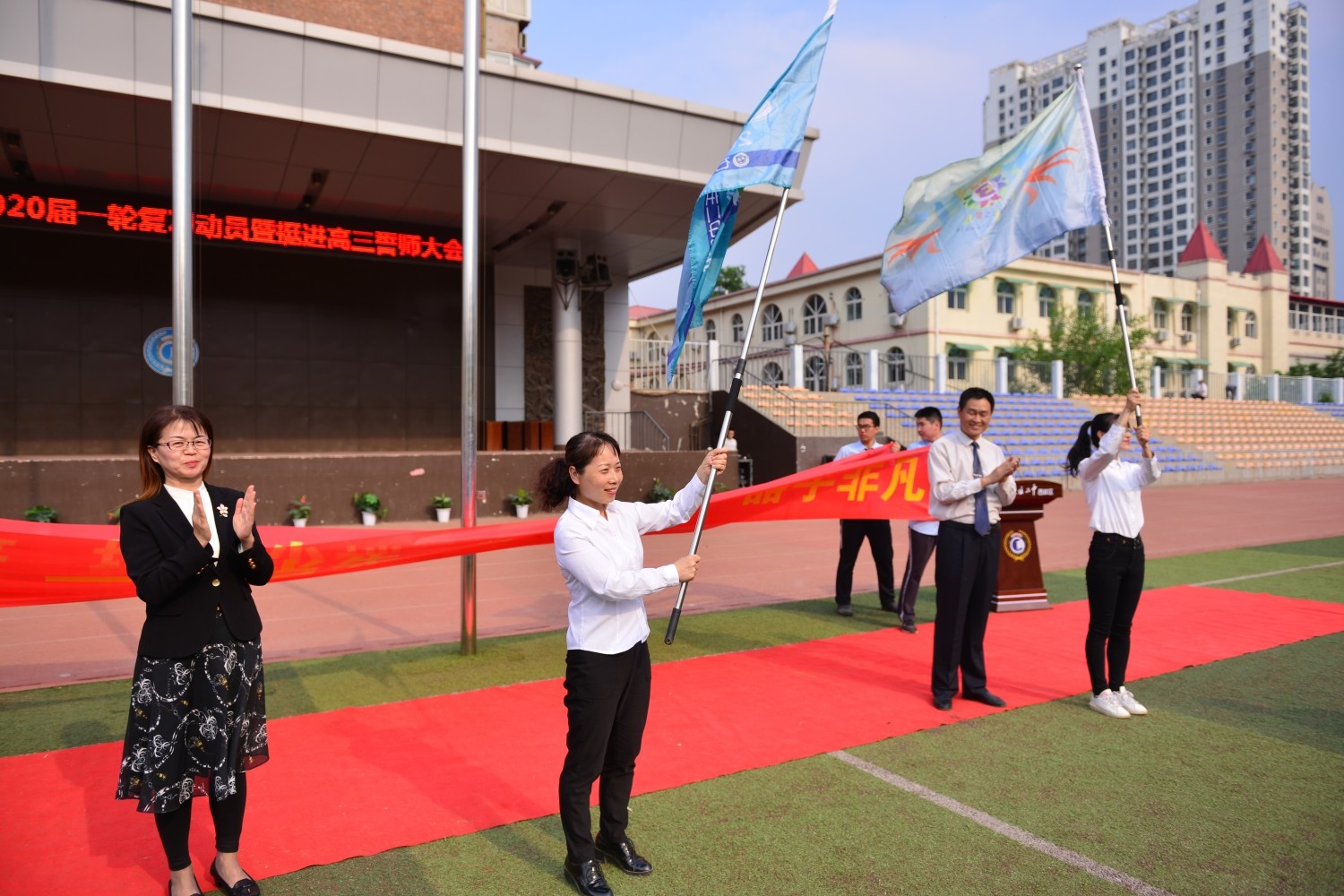 随后,学校领导为四位班主任授班旗,几位班主任面对着熟悉的面孔深情的念出对各位学子的寄语。各班班旗昂扬飘舞,各班口号嘹亮激越,声音响彻云霄,每一声口号中都是他们的誓言和信念,期待着同学们在高三的道路上走出最美的姿态。