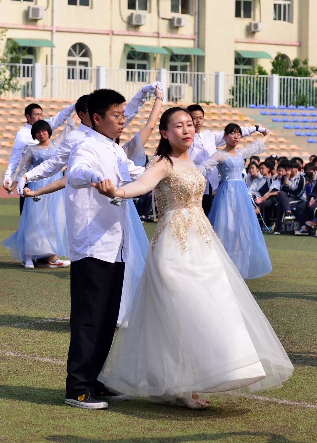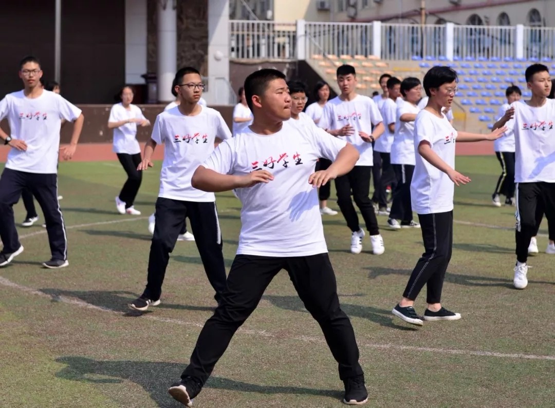 伴随着活泼的音乐节奏,同学们激情饱满,在运动场上尽情起舞。各参赛班级队型整齐、花样迭出,学生把个人表演的激情活力与集体舞的宏大场面完美结合,展示出的良好精神风貌。各班班主任也积极参与到本班集体舞的表演,形成了一道道靓丽的风景线。