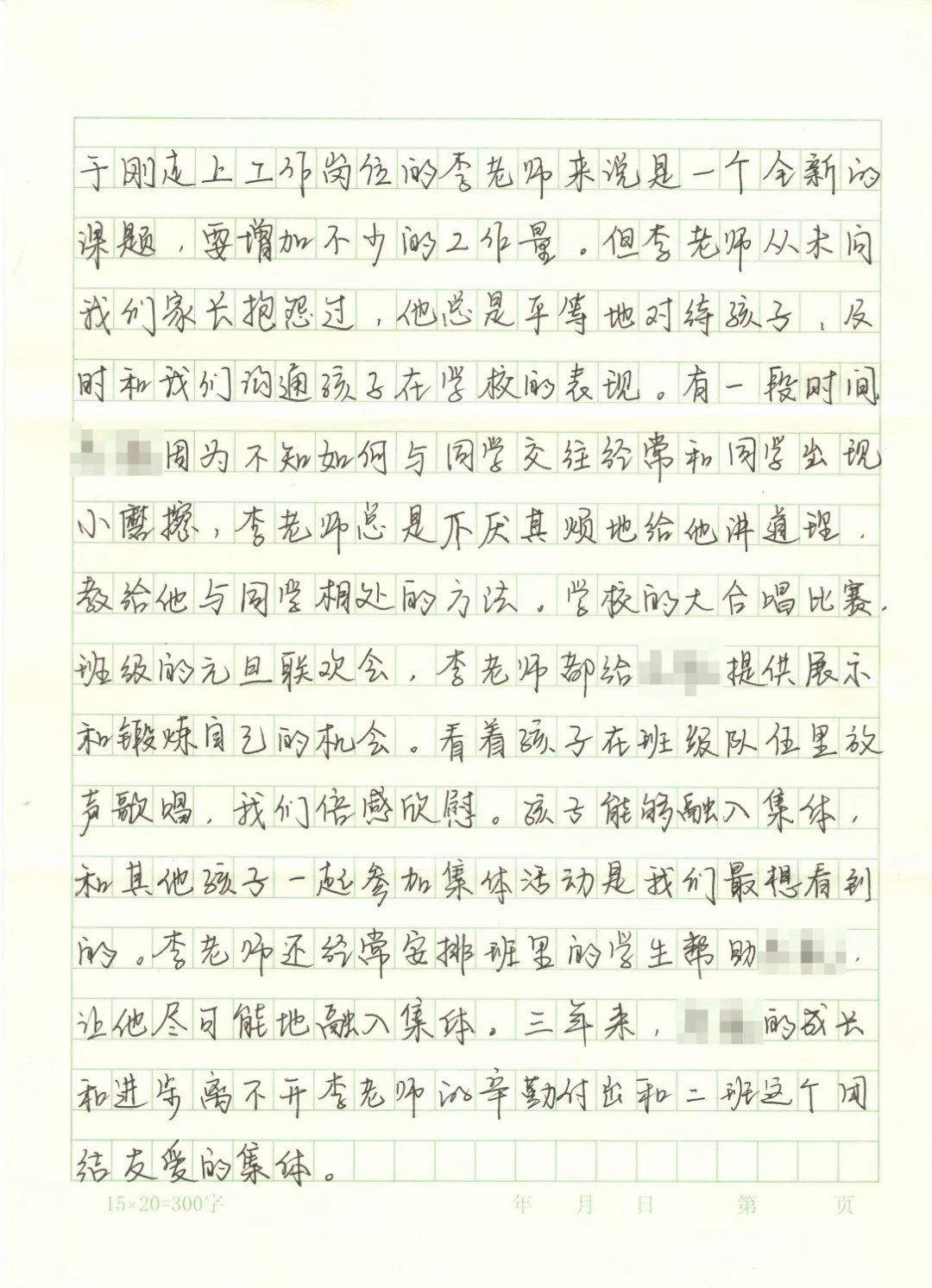 孩子的班主任李铮老师是和孩子们一起走入二中西的年轻教师,接收孩子就读,对于刚走上工作岗位的李老师来说是一个全新的课题,要增加不少工作量。但李老师从未向我们家长抱怨过,他总是平等地对待孩子,及时和我们沟通孩子在学校的表现。有一段时间,孩子不知道如何与同学交往,经常和同学出现小摩擦,李老师总是不厌其烦地教给他与同学相处的方法。学校的大合唱比赛,班级的元旦联欢会,李老师都给孩子提供展示和锻炼的机会。看着孩子在班级队伍里放声唱歌,我们倍感欣慰。孩子能够融入集体和其他孩子一起参加集体活动是我们最想看到的。李老师还经常安排班里的学生帮助孩子,让他尽可能地融入集体。三年来,小刚的成长和进步离不开李老师辛勤付出和二班这个团结友爱的集体。