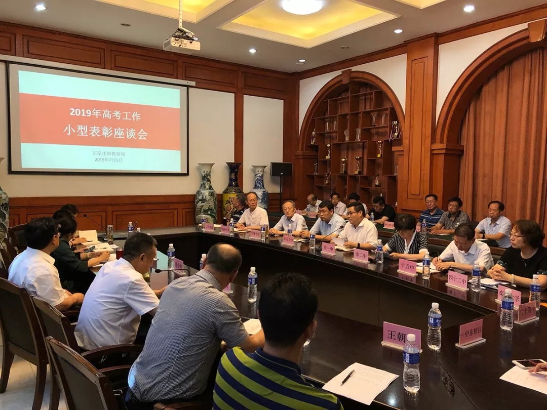 7月5日上午,石家庄市教育局召开了2019年高考工作小型表彰座谈会。 市委教育工委副书记、市教育局党组书记、局长张少华,副局长赵立芬,市教科所所长张建英等出席会议。29所高中 学校的校长参加了会议。 会议由市教科所所长张建英主持。