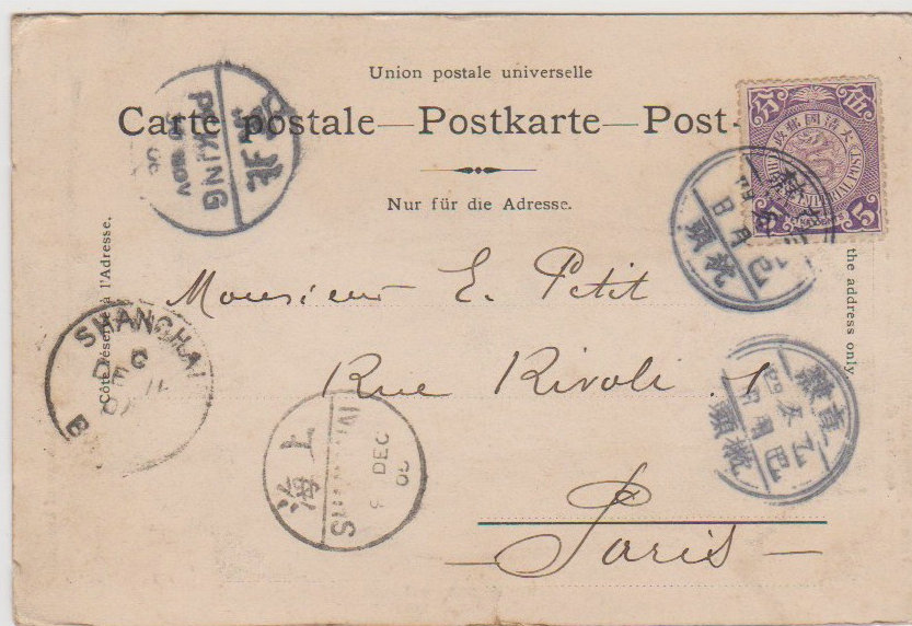乙巳年(1905年)经北京、上海中转,走海上邮路,寄达地法国