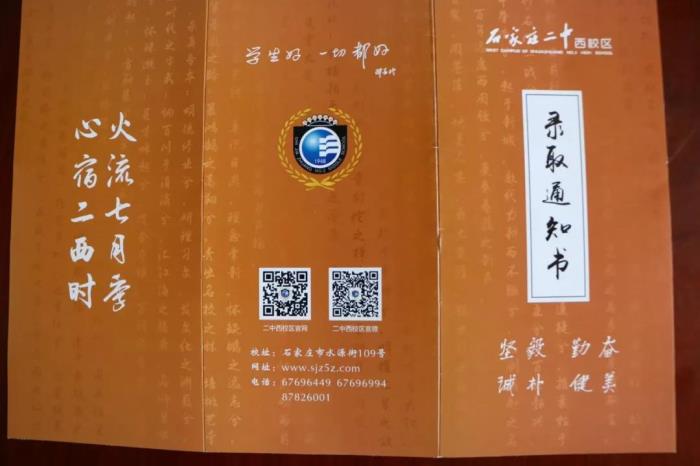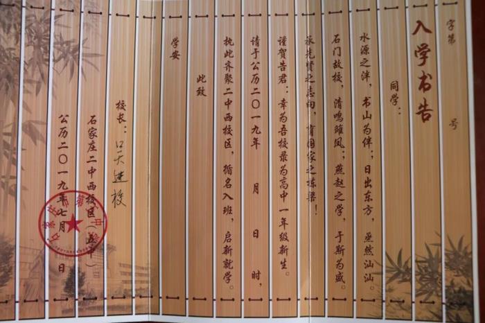 学校的通知书独具匠心,令学子们眼前一亮。它端庄而厚重,充满古风古韵 。上书 “水源之泮,书山为伴;日出东方,烝然汕汕。 石门故校,清鸣雏凤; 燕赵之学,于斯为盛。承先贤之志向,育国家之栋梁!”落款由 吴校长亲笔书写。