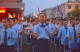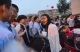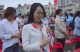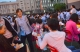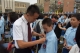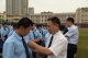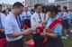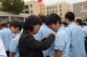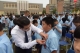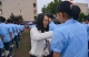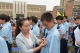 校领导和老师步入新生队伍为新生佩戴校徽