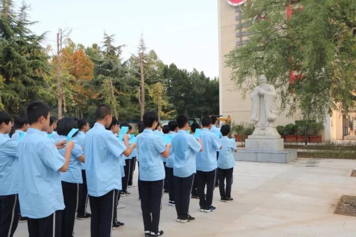 出发前,我校在孔子像前举行了庄重的仪式,吴进校校长等学校领导带领学生向孔子行礼,张永泽副校长、邢玉彬主任向孔子像敬献了鲜花。
