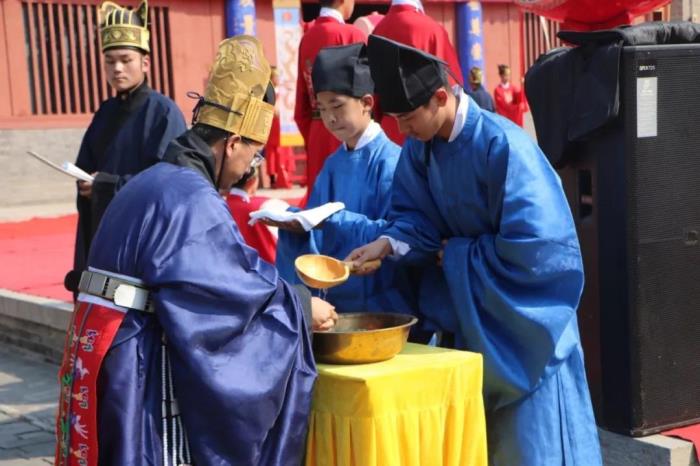 传统释奠礼部分属于非物质文化遗产,由就位、迎神、奠帛、献礼、乐奏等环节组成,随着大成钟鼓、编钟编磬的铿锵音节和笙篪笛箫、琴瑟埙歌的悠扬雅乐,百余名参礼人员身着传统礼仪服饰,按照释奠仪节,升歌起舞,与现场观礼人员一起致敬中华文化的至圣先师和往圣先贤。
