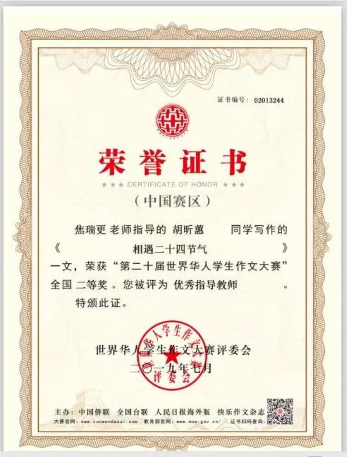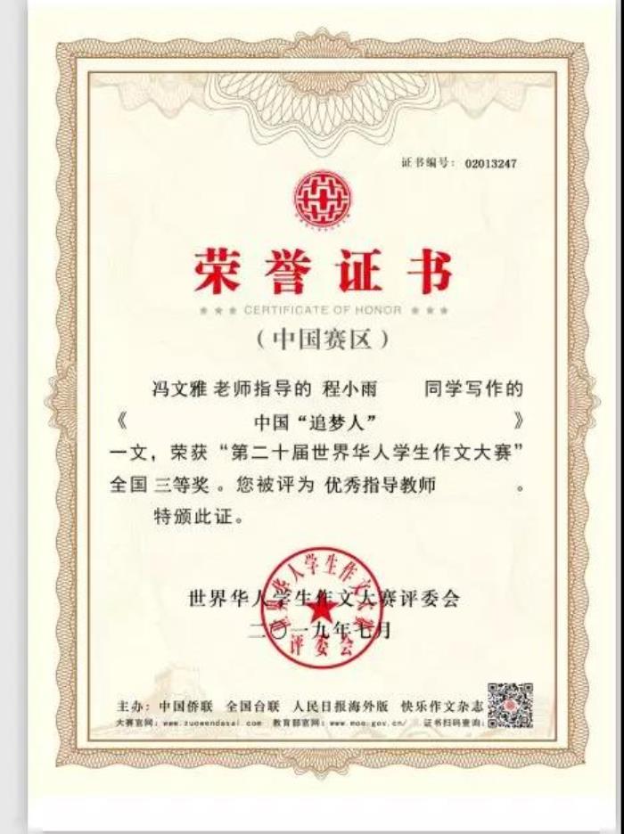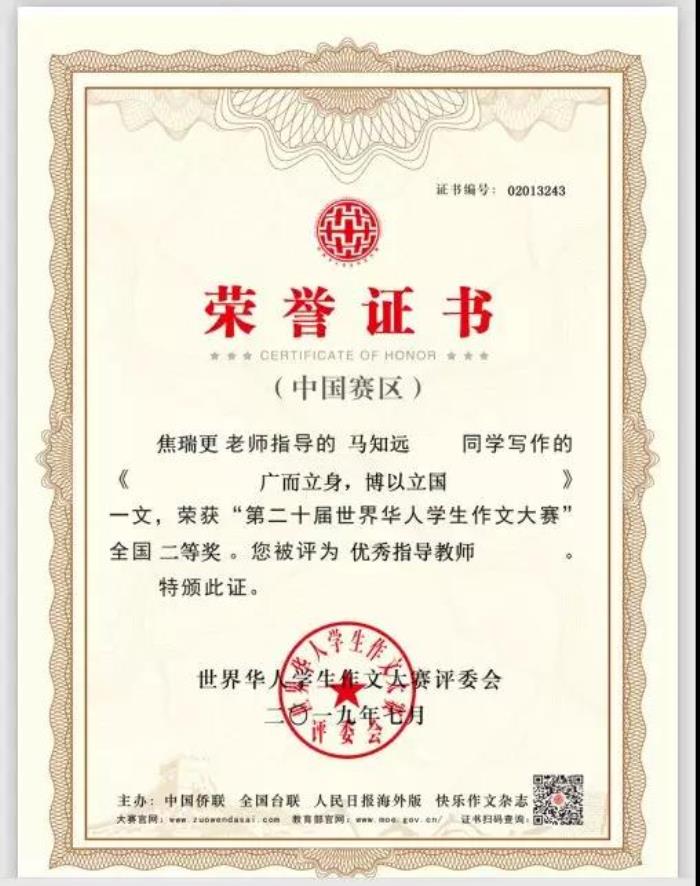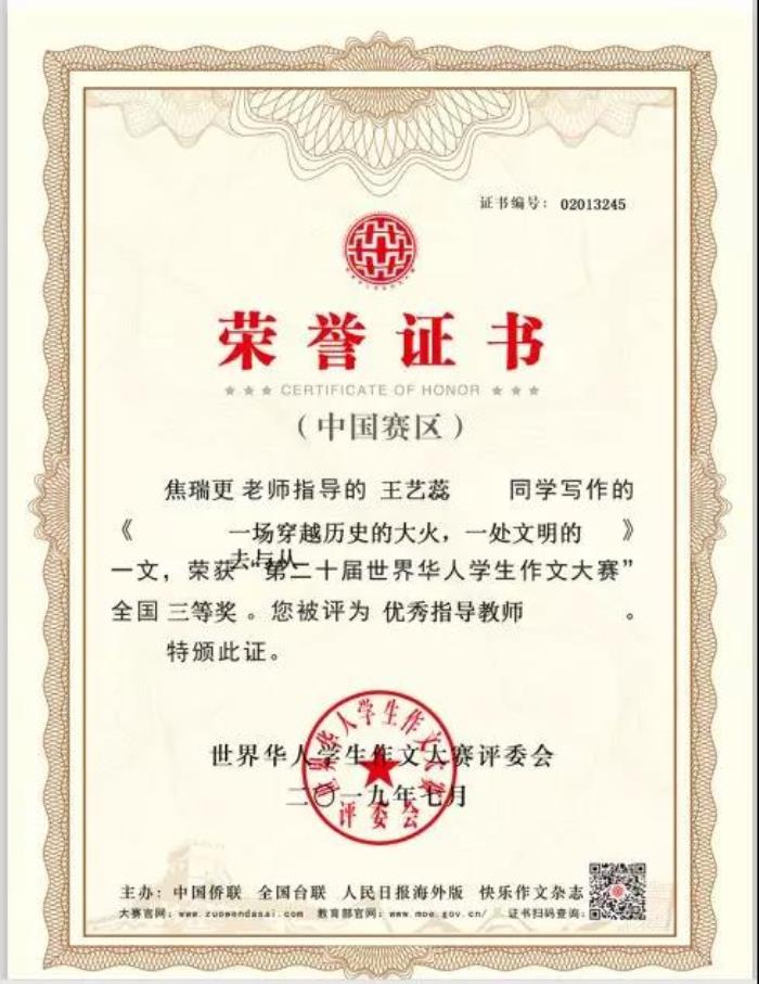 本届大赛以“中国变化”“家乡味道”为主题,共吸引来自34个国家和地区的近300万名学生参加。其中,我校高三4班郝乐行同学的《以变革之星火,燃九州之明耀》获得一等奖,程小雨同学获得三等奖;高三1班刘泽陆、马知远、胡昕蕙同学获得二等奖,王艺蕊同学获得三等奖;高二4班温天宇同学获得三等奖。王云凤、冯文雅、焦瑞更老师获得优秀指导老师称号。在此向各位小作家和指导老师表示祝贺!