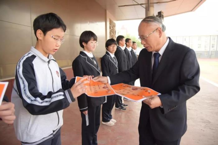 校长助理、安全处顾庆龙主任为先进班集体和宿舍代表颁奖