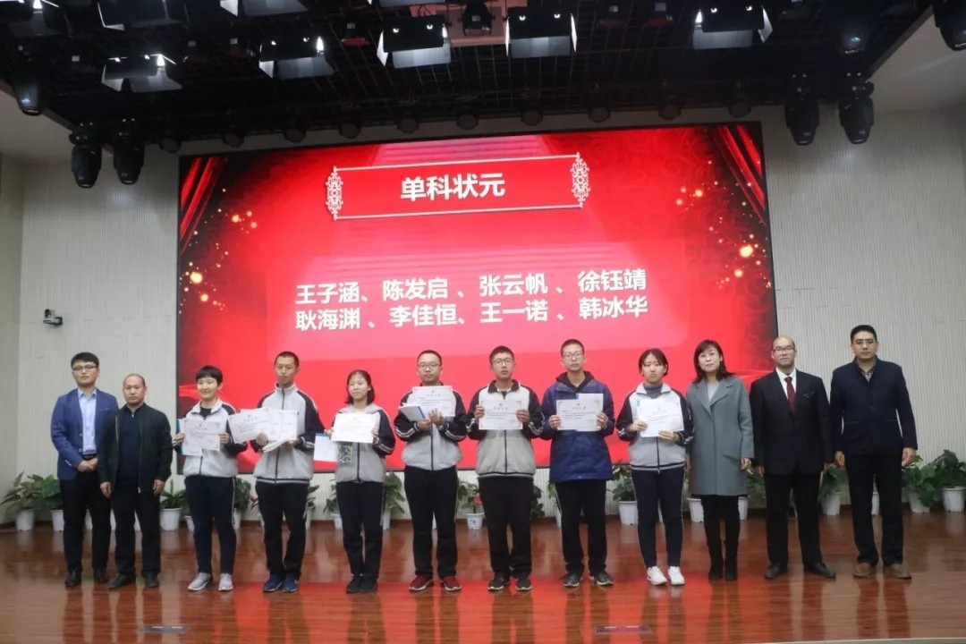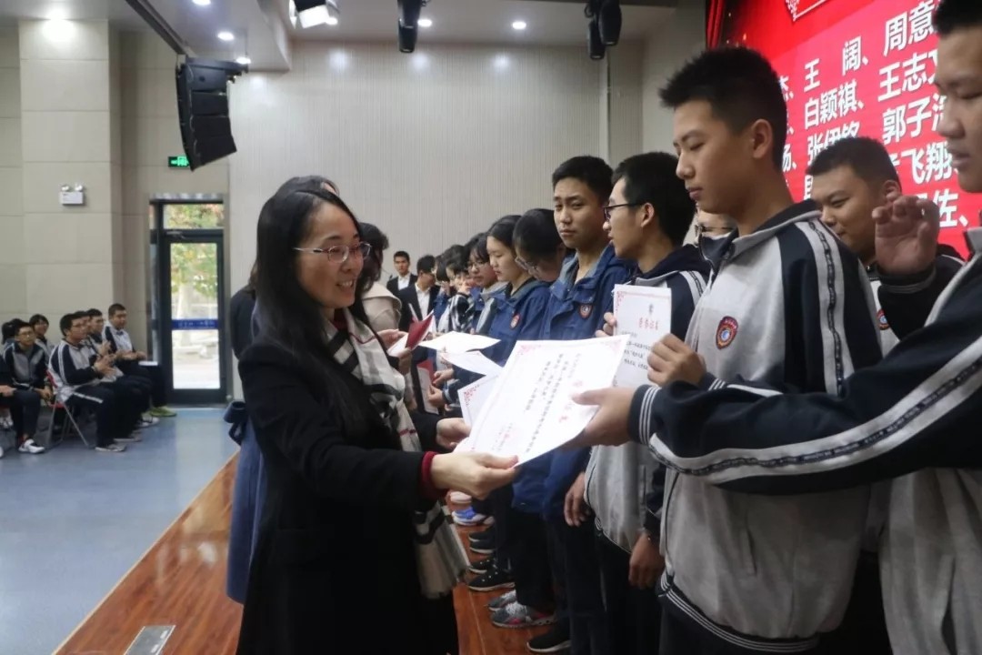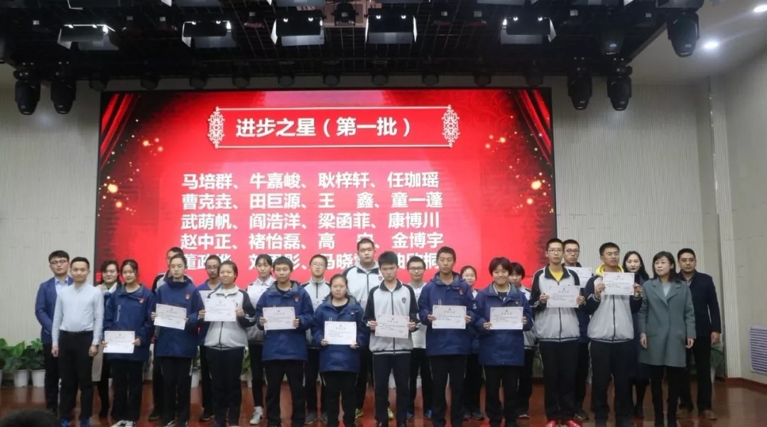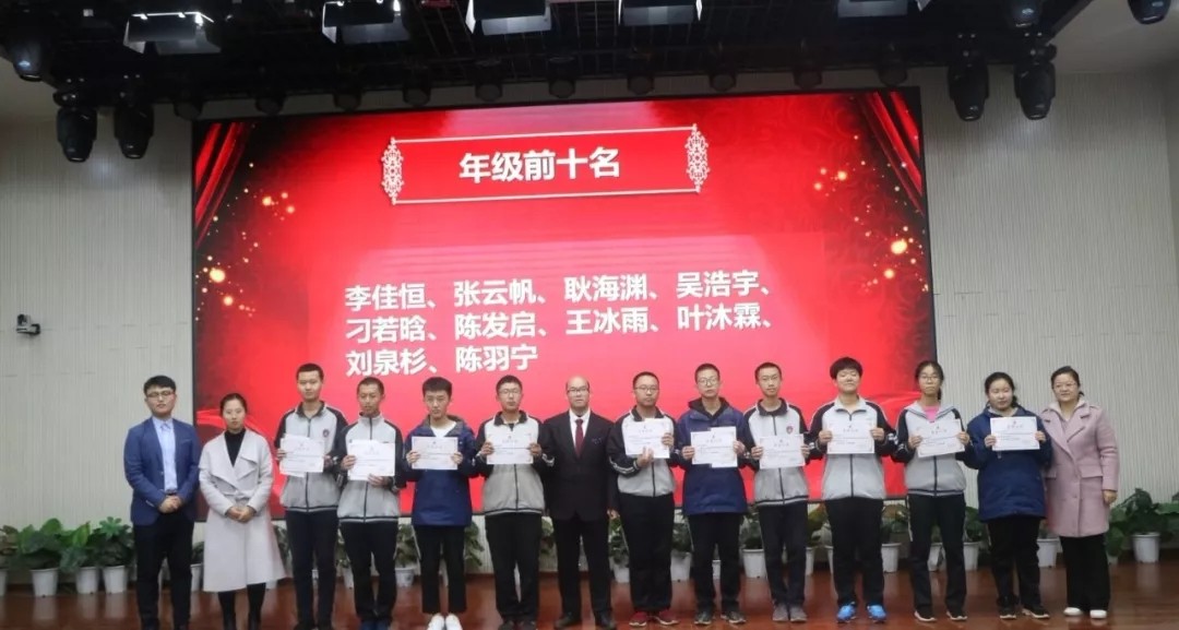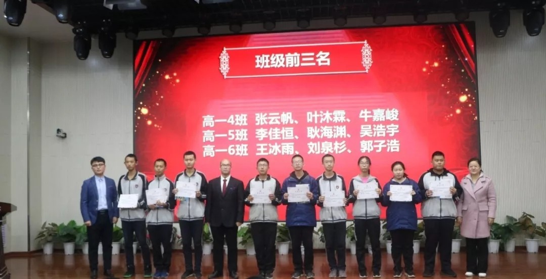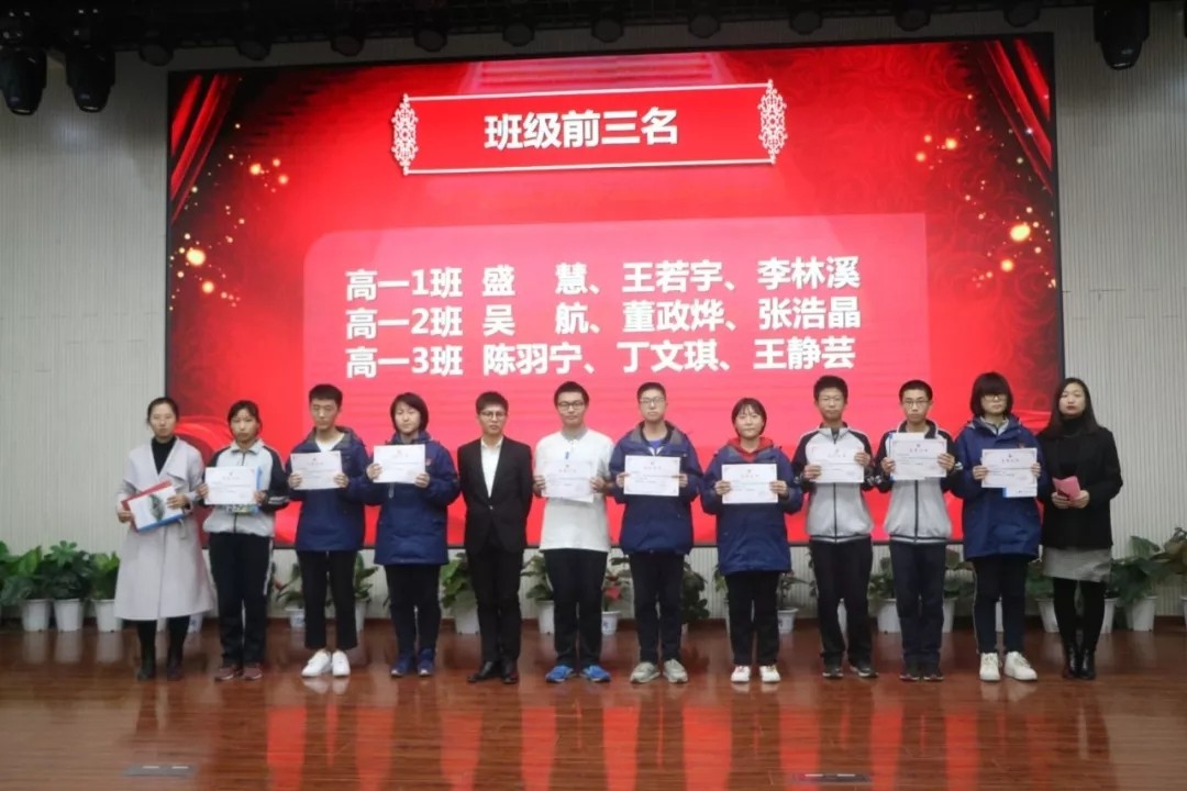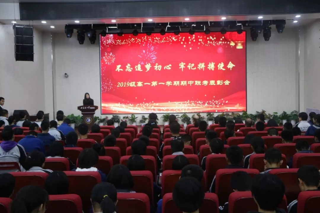 首先,高一年级副主任周亚静老师宣布期中联考表彰名单,名单包括“年级进步之星”、“单科状元”、“班级前三名”以及“年级前十名”。各位班主任和科任老师分别上台为获奖学生颁发奖状、奖品并合影留念,报告厅内掌声雷动,气氛热烈。