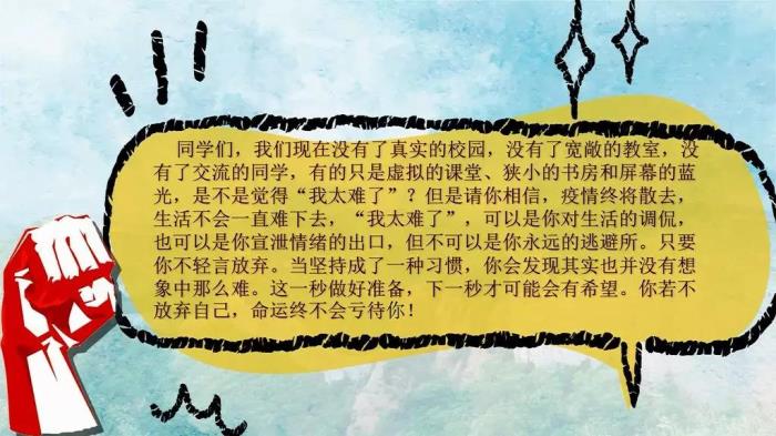 同学们:因为疫情,你们也许有生以来第一次知道并且体会到了什么叫“隔离”;因为疫情,你们有了一个意料之外漫长并且难熬的假期和居家线上学习体验;因为疫情,你们开始想念你的同学,你的老师,你的课堂,你的校园……但我想说的是,隔离的是病毒,阻断的是疫情。在社会中,在世界上,每个人都不可能独立存在;每个家庭也都不是一座孤岛;我们仍和世界有着关联;我们师生的心永远连在一起!
