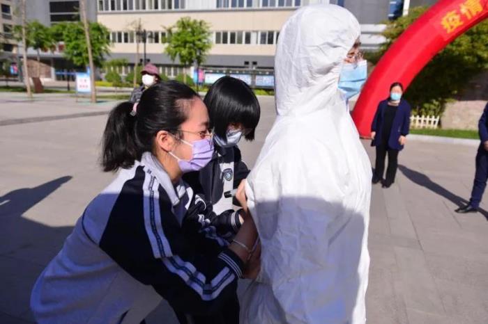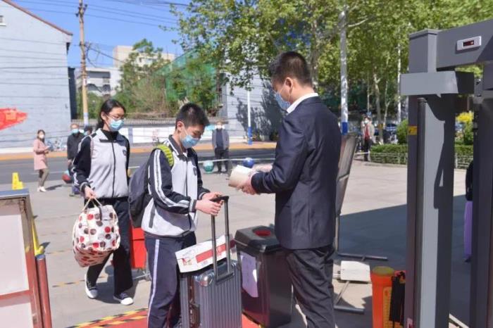 上午十点,孙福山校长拉响钟声,高三学生陆续到来。学校全体领导、高三教师列队鼓掌,为同学们加油鼓劲。在校门入口,设置了红外线体温检测仪和温馨提示板,大家按照要求,陆续间隔通过划定的消毒测温通道,进入校园。安保人员及值班老师分工就位,密切注视着体温监测数据。