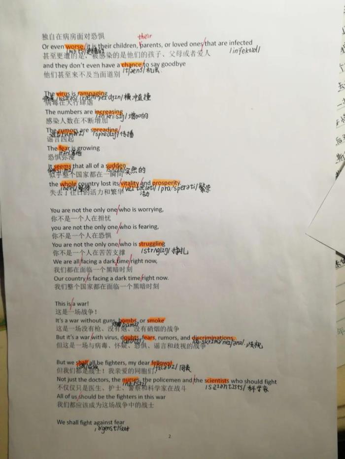 活动前年级主任精心组织、广泛发动,各位英语老师认真辅导,仔细评比,全体学生积极参与。为充分调动同学们的学习兴趣,比赛所选取素材除老师们所建议的抗击疫情励志演讲素材之外,同学们也可以自选素材进行配音,满足了不同层次的学生的发展需要,充分展示了学生的个性魅力!