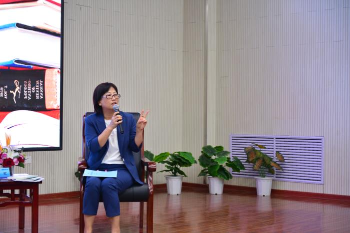 接下来,二中特级教师、正高级教师王艾华老师结合实际教学,介绍了怎样一步步完成一本书的阅读。王艾华老师表示,她通过跳读、速读,个别地方精读,用一天时间完成了一本书的阅读。根据她的经验和体会,一本书有很多阅读方式,可以精读,可以泛读。但阅读的步骤和过程一定要严谨,思路要清晰。王艾华老师还就整本书阅读的课型做了一些搜集,无私地与在座的老师和家长分享。
