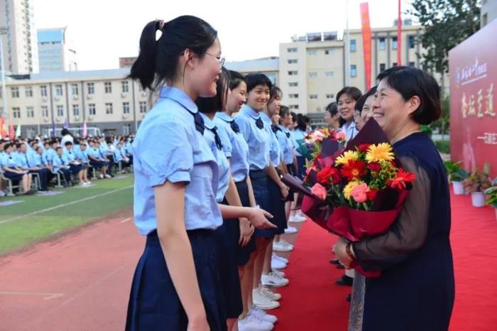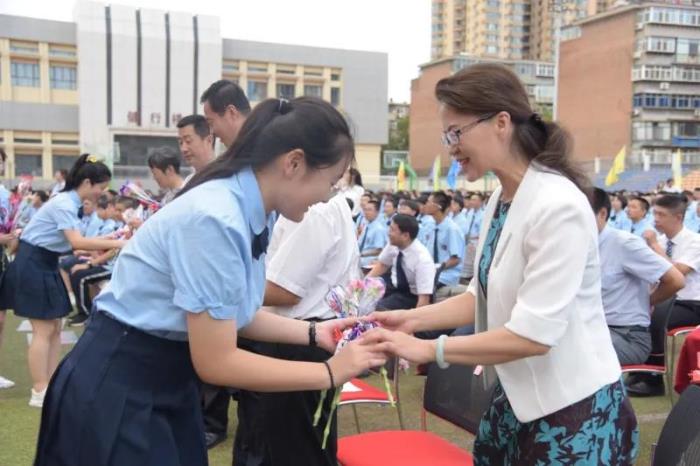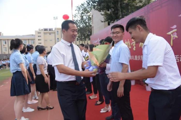 辛勤耕耘三十载,满园桃李竞芬芳。今年学校又有教师光荣从教30年,他们登上主席台,接受领导献上的鲜花和真诚的祝福。随后, 2019届高三先进备课组理综组、2020届高三、初三毕业班老师、全体班主任分别登台接受献花。然后, 学校领导每人抽取幸运星同学并请他最喜欢的老师上主席台合影留念。