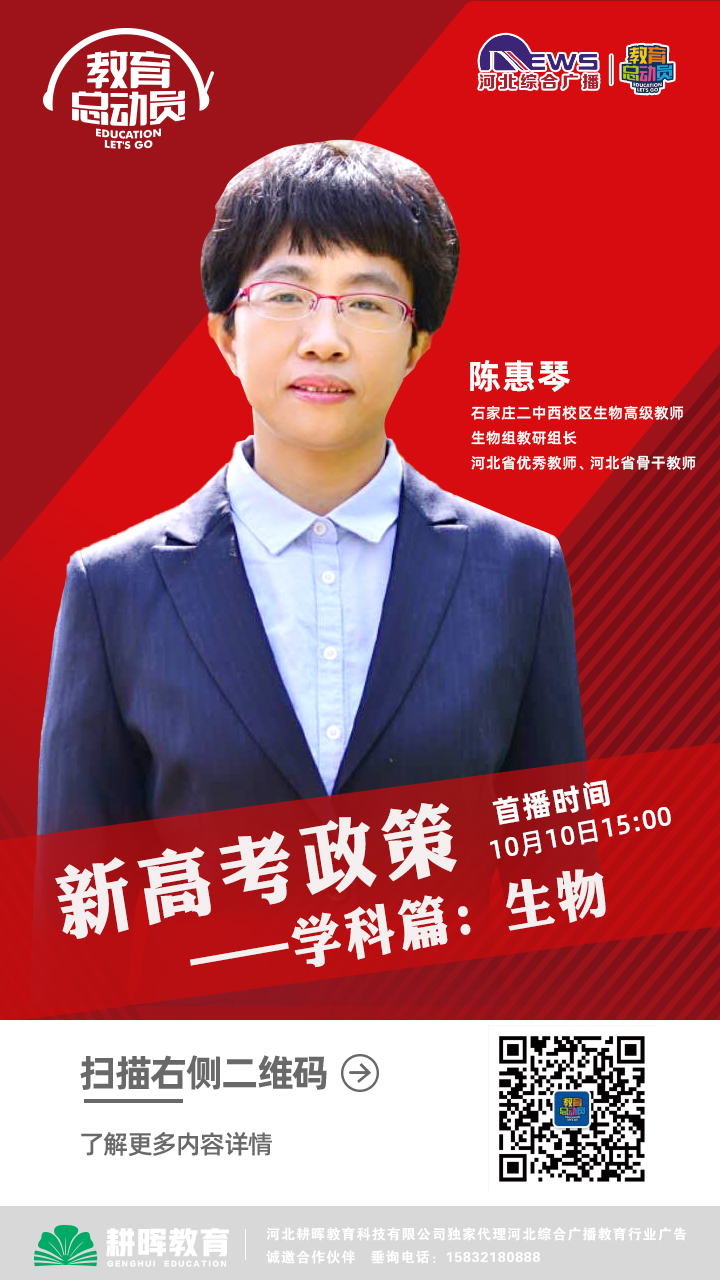 石家庄二中西校区陈惠琴老师做客河北综合广播“教育总动员”栏目,从生物学科的角度解读新高考政策,欢迎收听!