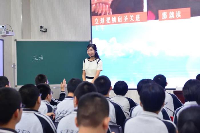 首先,由来自正定六中的刘丽媛老师和本校张茜老师同课异构,展示课例《夯实法治基础》。我校张茜老师打破教材框架,以历史进程为主线,通过“探寻法治脚步”、“描绘法治蓝图”两个教学环节设计,从古至今宏观展示了我国的法治进程,由远及近落实于学生生活,为夯实法治基础做出自己的贡献。刘丽媛老师以《民法典》为线索,通过“法治初相识”、“法治深体悟”和“法治绘蓝图”三个环节,围绕法治是什么、为什么、怎样做三个层次,逐层展开,逻辑清晰。两位老师娓娓道来,又各具特色,受到与会老师们一致的点赞。