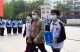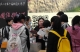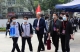 学生志愿者在校门口迎接全国著名大学的专家教授