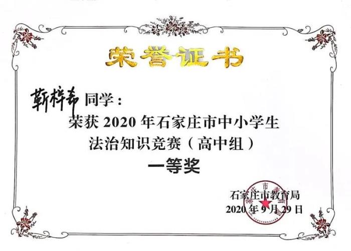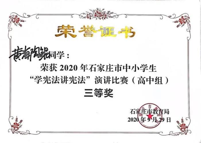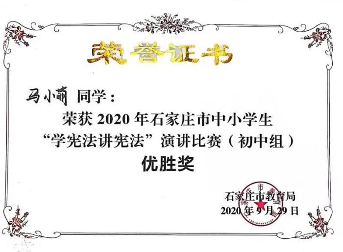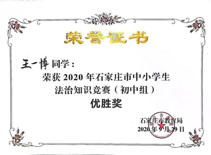 我校安全处积极组织报名参加活动,在初二、高二年级主任和班主任的支持和指导下,高二4班靳梓希同学获得高中组法治知识竞赛一等奖,高二3班黄海陶鲲同学获得高中组演讲三等奖,初二2班王一博、马小萌同学分别获得初中组竞赛和演讲优胜奖。同时,我校获得优秀组织单位的荣誉。