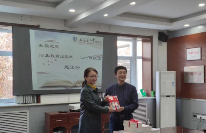 11月19日,弘毅之帆——河北教育出版社与二中西校区恳谈会暨赠书仪式在躬行楼三楼会议室召开。河北教育出版社雷斌副社长、我校樊茹副校长、教务处常乐主任以及语文组教师参加了活动。