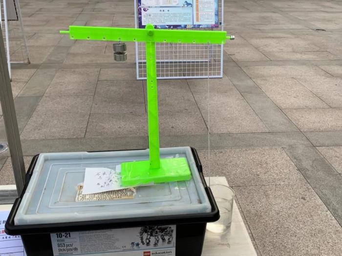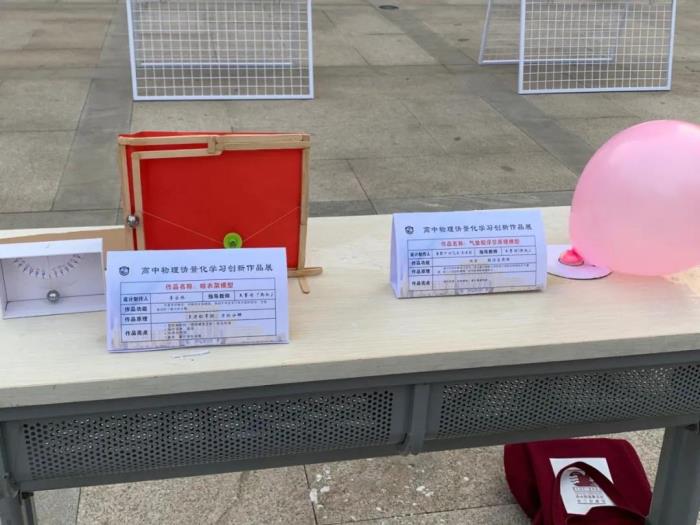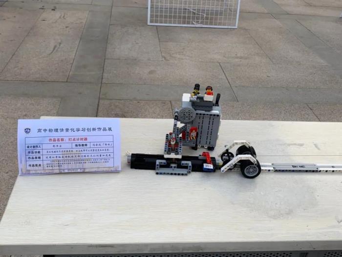 分会场的活动也精彩纷呈。我校学生的科技创新小制作、自制教具形式新颖,灵感爆棚,普遍受到参观者的好评。其中高一7班邵泽家同学制作的打点计时器,运用杠杆原理与单杠发动机原理使铅笔做往复运动,在纸带上留下痕迹,处理纸带可以求解速度和加速度,打点准确清晰,小车顺滑阻力小,过程简单有趣,特点鲜明. 该作品得到了所有参观者的赞赏,一举夺得本次创新小制作展一等奖第一名,体现了我校学生的实力,为西校区争得了荣誉。