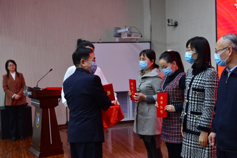 一年来我们携手并肩,辛勤耕耘,成果丰硕。张永泽副校长、张尚英副校长分别宣布了各类荣誉奖项。一项项荣誉称号的背后是对大家努力的肯定和实力的褒奖。鸾翔凤集栖桐枝,百卉含英秀杏坛。樊茹副校长宣布了对2020年在各方面做出突出贡献,表现出色优秀教工的表彰决定并颁奖。封帅老师代表党员先锋示范岗、刘丛敏老师代表高考功勋教师、张翠芳老师代表中考功勋教师、李宁老师代表联考标兵、王丽双老师代表优秀班主任分别发表了获奖感言。随后,学校召开第四届第五次教代会,查利主席做工会工作报告,张尚英副校长做学校财务报告,工会委员李艳英做提案工作说明。
