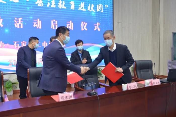 启动仪式上,我校张永泽副校长致辞,对各位领导的到来表示欢迎,并对同学们提出了学习要求;河北省教育基金会会长袁彦昭同志和河北省律师协会副秘书长张东山同志分别讲话,并介绍公益宣教活动的内容和重大意义,希望活动能够助力学校的依法治理,增强同学们的法治观念;我校学生焦程同学代表全校学生们做了表态发言。随后,我校张永泽副校长代表我校和河北金龙律师事务所代表彭江民律师共同签订了“普法教育共建单位”协议。
