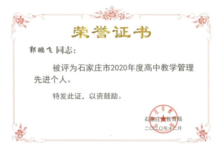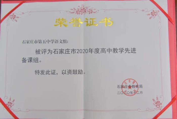 近日,石家庄教育局评选出了2020年高中教学先进单位及个人。继18、19年,二中西校区再次获得石家庄市“高中教学先进单位”称号。我校语文备课组被授予“先进备课组”称号。教务处郭鹏飞副主任、年级郝金亮主任获得高中教学管理先进个人称号。