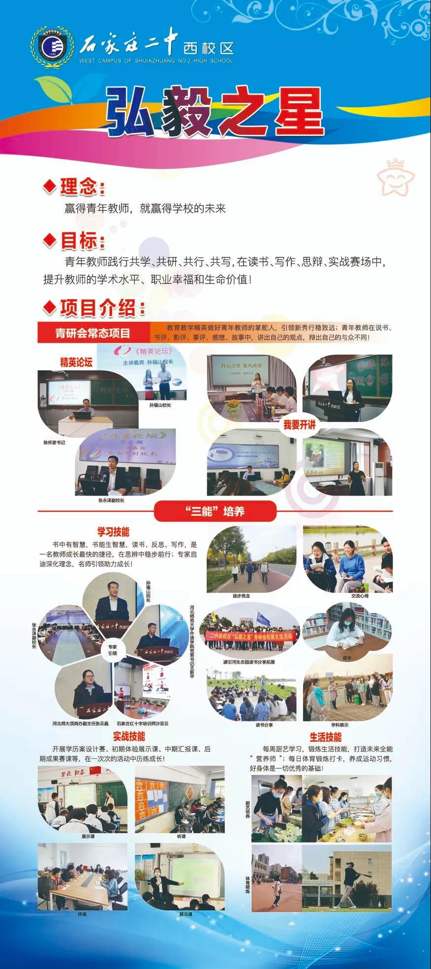 青年教师是学校的希望和未来,学校一向重视青年教师的培养。学校推出“弘毅之星”项目,依托青年教师成长研究会,着眼于促进青年教师成长,培养学习型教师,为青年教师搭建成长的舞台,真正实现“共学、共行、共写、共研”。