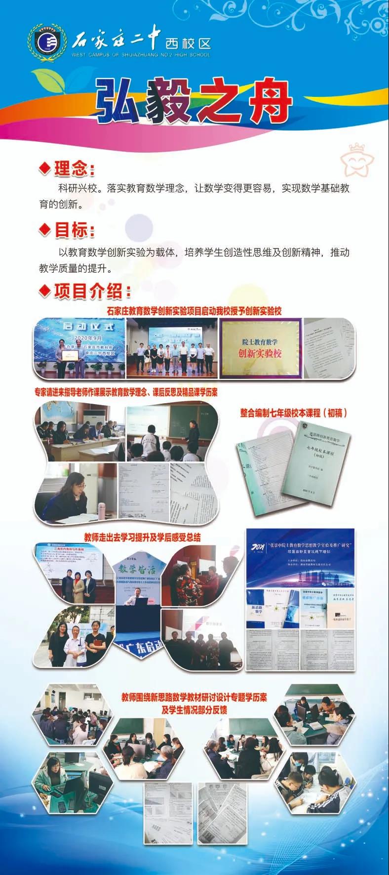 二中西校区“弘毅之舟”项目,由中科院张景中院士指导,旨在推广教育数学创新实验,并通过此项目提高学生对数学的兴趣,让同学们爱上数学,培养数学思维,进而推动中学数学的教学质量提升。