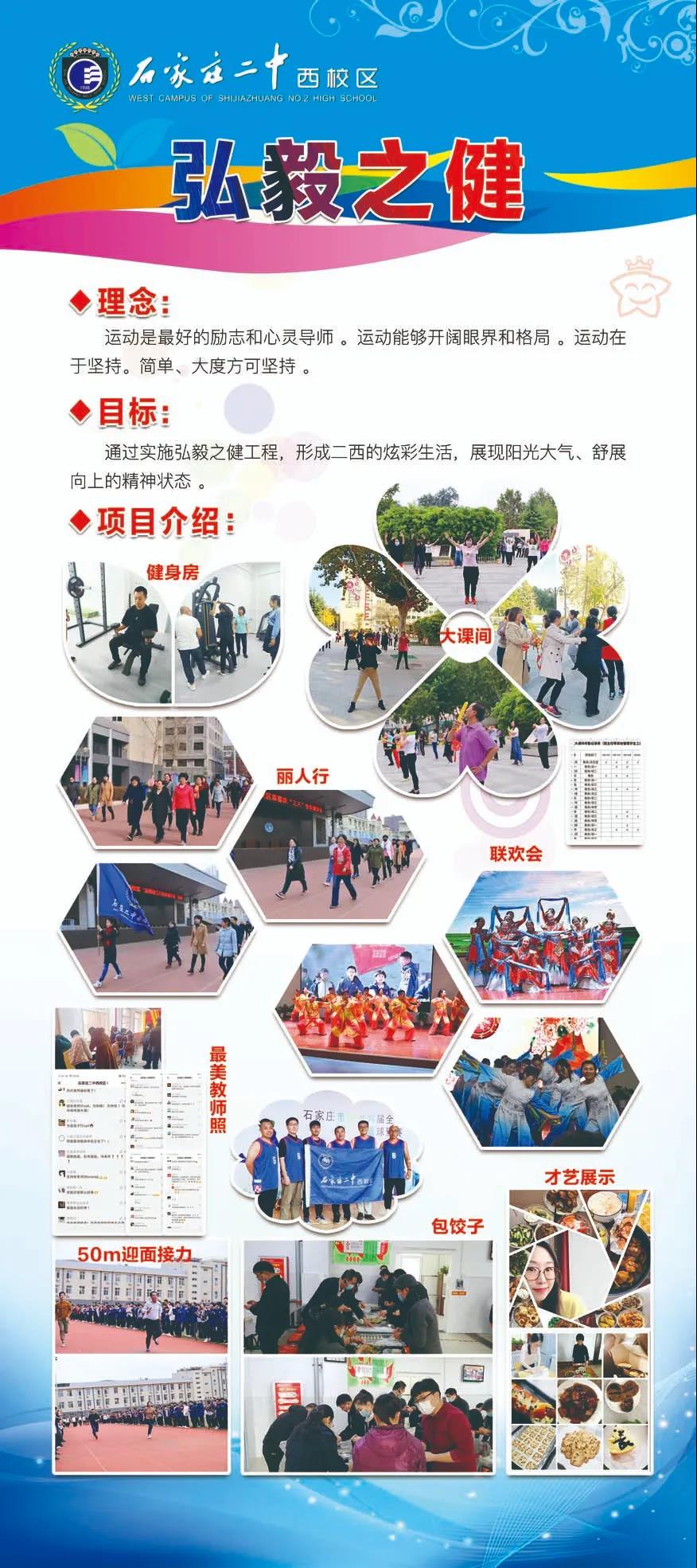 为促进教职工身心健康发展,丰富教职工文化生活,二中西校区工会积极推进我校“弘毅之健”工程,开展一系列的职工文体活动,使全体教职工树立“快乐工作,健康生活”理念,养成良好的健身习惯,以健康的体魄、饱满的热情、乐观的心态,展示出校园风采。