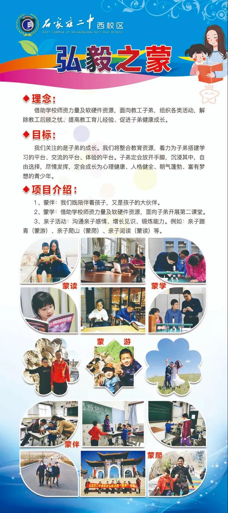 “弘毅之蒙”项目,通过借助学校师资力量和资源,组织教工子弟参与各类活动,搭建学习、交流、体验的平台,解除教工的后顾之忧、提供教工育儿经验,促进子弟健康成长。