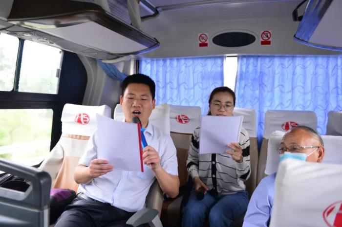 出发前张尚英副校长在大巴车上为大家作了动员讲话,希望每位党员同志能够在本次研学活动中认真学习,有所感悟。之后学校各个支部代表采用合唱、朗诵的方式向建党一百周年致敬,博得阵阵掌声。