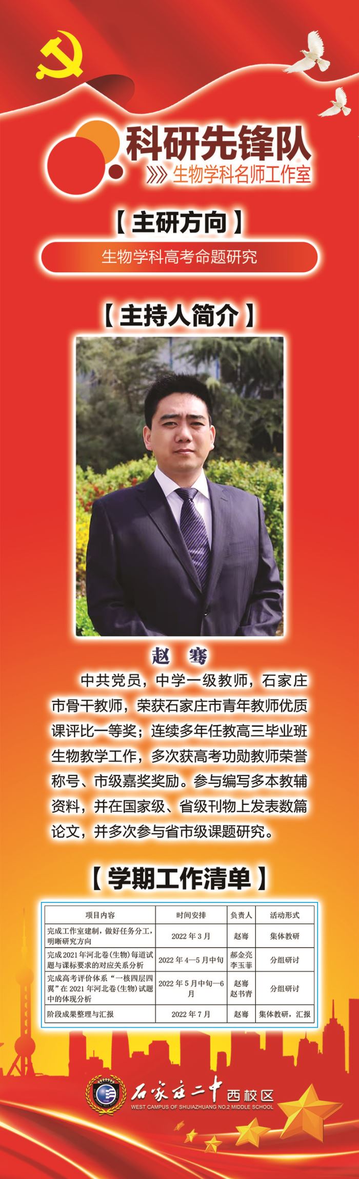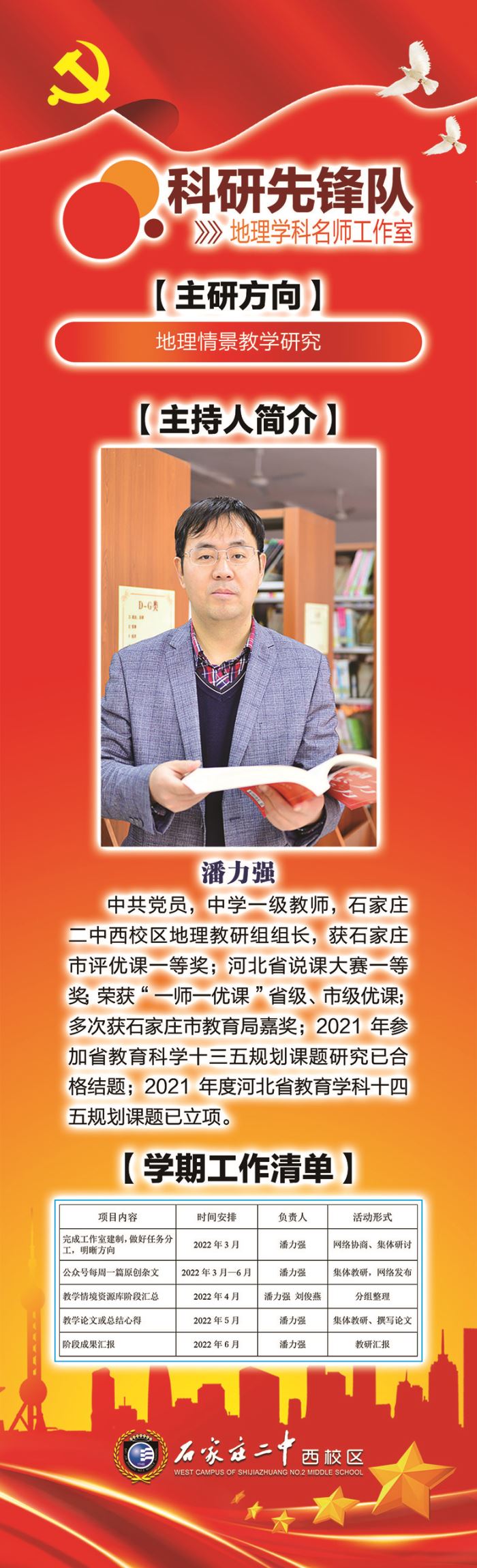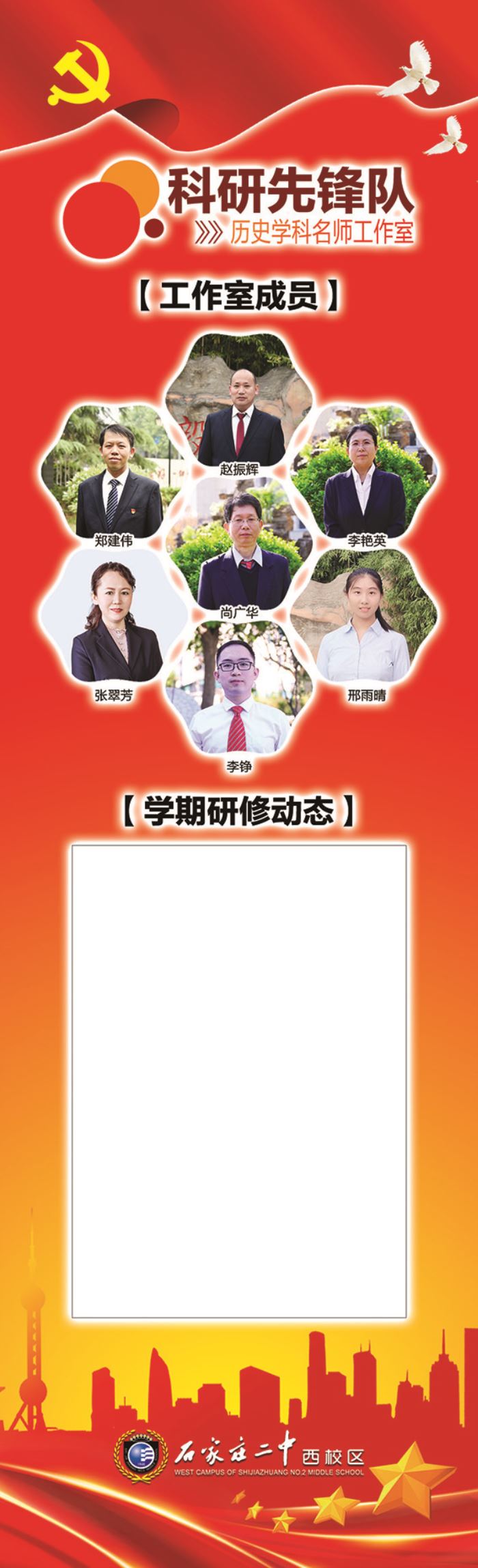 2022年3月以来,石家庄二中西校区名师工作室经过申报与学术审核,目前已经有九个科研先锋特色工作室进入实质工作阶段。分别是:历史学科王润萍老师主持的“初高中历史教学衔接与评估研究”工作室、物理学科闫会波老师主持的“题库建设与知识点和考点整合”为研究方向的工作室;生物学科赵骞老师主持的“生物学科高考命题研究”工作室;体育学科陆杨老师主持的“体育教学”为研究方向的工作室;信息技术学科刘洋老师主持的“计算思维在教学中的实现”为研究方向的工作室;语文学科焦瑞更老师主持的“跨媒介阅读与交流研究”工作室;化学学科郝纬老师主持的“高中化学试卷讲评课的高效性研究”工作室;地理学科潘力强老师主持的“地理情景教学研究”工作室;政治学科张茜老师主持的“思政课程与校园文化建设”为研究方向的工作室。