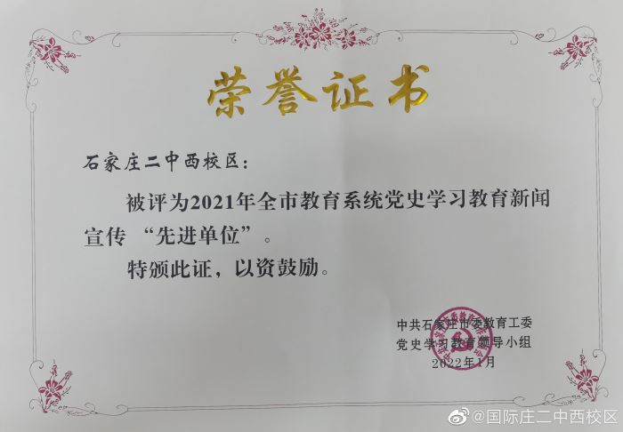 石家庄二中西校区荣获市教育系统党史学习教育新闻宣传先进单位称号
