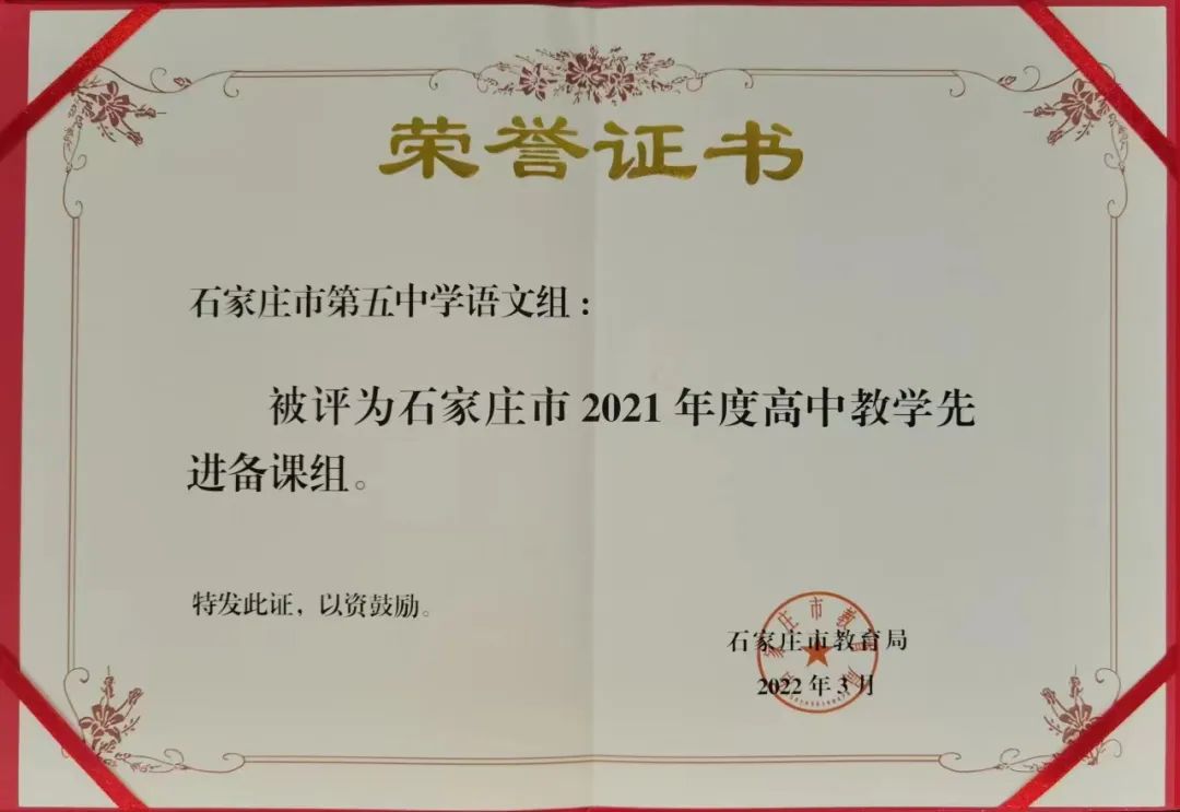 近日,石家庄教育局评选出了2021年高中教学先进单位。 继18、19、20年, 二中西校区再次获得石家庄市“高中教学先进单位”称号。我校语文备课组、物理备课组被授予“先进备课组”称号。