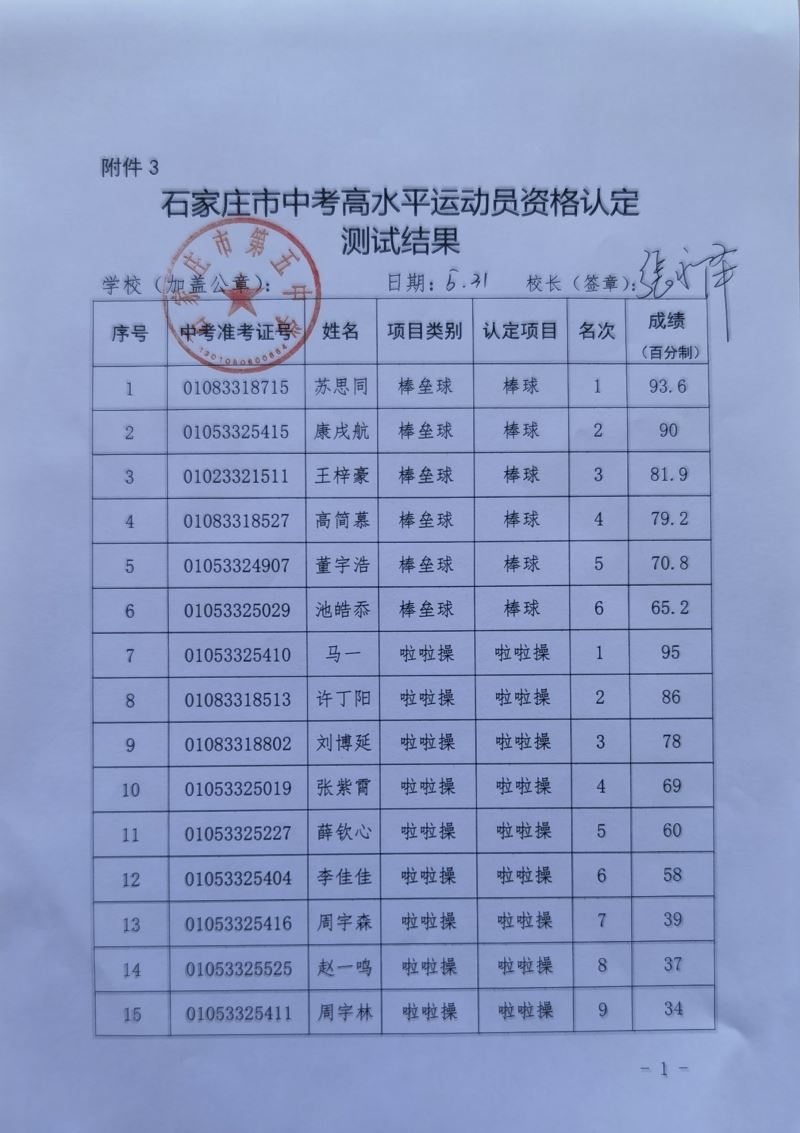 石家庄市中考高水平运动员资格认定 测试结果的公示