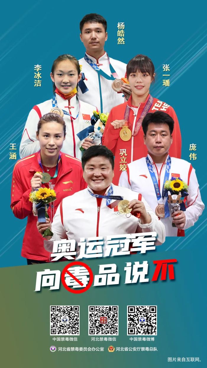 2022年6月是全民禁毒宣传月,“6.1”是《禁毒法》实施纪念日、“6.3”是虎门销烟纪念日、“6.26”是国际禁毒日。省禁毒办围绕“健康人生、绿色无毒”主题,特邀河北籍奥运冠军巩立姣、庞伟、王涵、杨皓然、李冰洁、张一璠拍摄制作了禁毒公益宣传片及宣传海报。