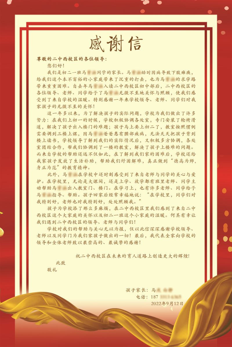 伴随秋风送爽,又到开学季,石家庄二中西校区敞开大门迎接着暑假归来的同学们,同时也收到了一份特别的礼物——一封《感谢信》。