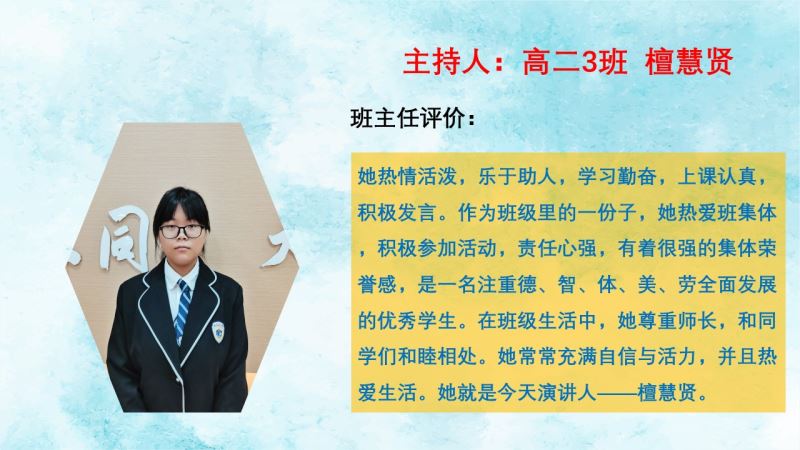 大家上午好!我是来自高二3班的檀慧贤。今天我国旗下演讲的主题是“抓好常规 促我发展”。
