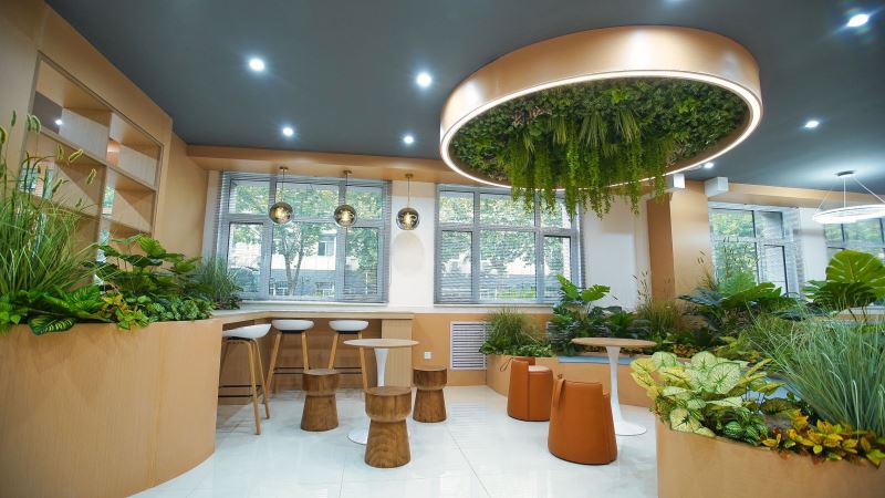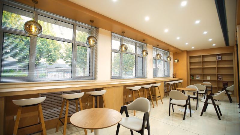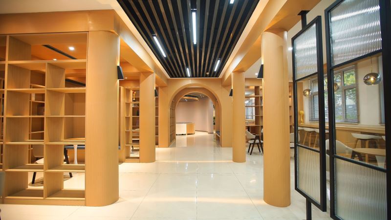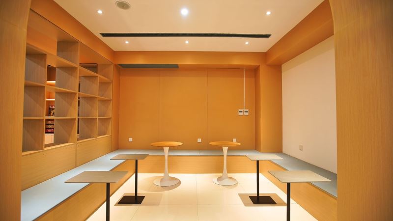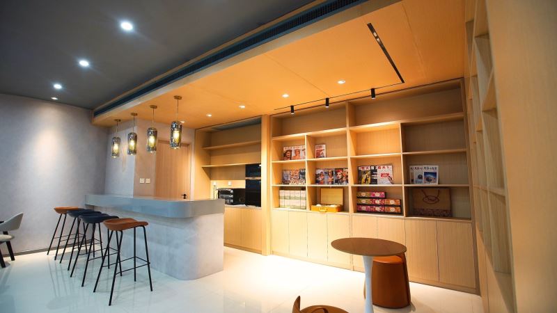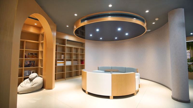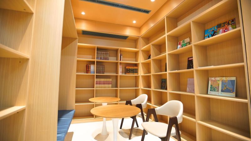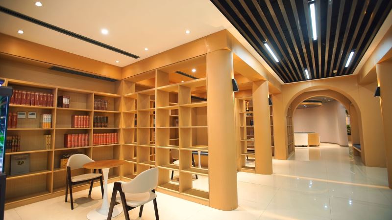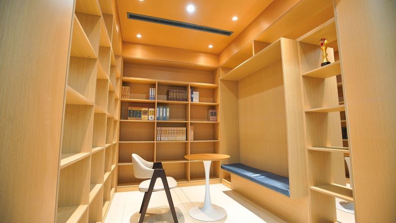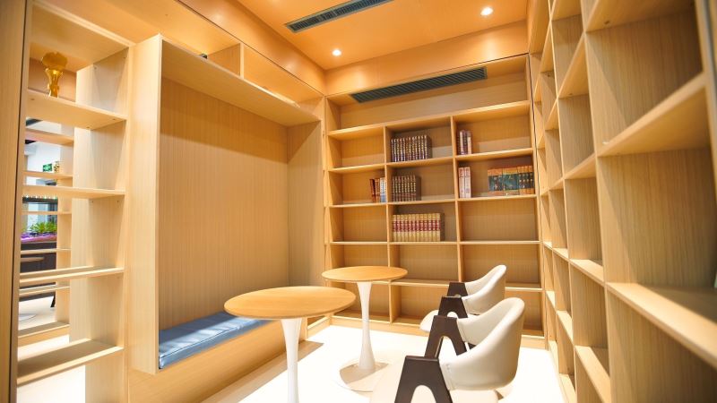 弘毅书院以阅读、开放、赋能、成长为指导理念,采取针灸式的小微空间更新方式,实现空间可阅读、共享有温度、成长更幸福的建设目标,并划分了阅读区、研讨区、文创区、演讲多功能区等区域,是一个阅读、交流、讨论、沉淀心灵的场所。多样化的空间布局,满足老师、学生、家长的不同需求。推动师生、生生、家校之间的交流互动。在内部空间结构上,书院以阶梯式方式呈现为基础,搭配镂空式墙壁,原木色的大型组块式书橱,阶梯桌椅与原木色家俱让空间更有亲和度,同时咖啡+茶吧,及品茶区等服务的注入可以提升停驻时间,一些简单的轻食或点心,也让心灵更加满足和舒适。