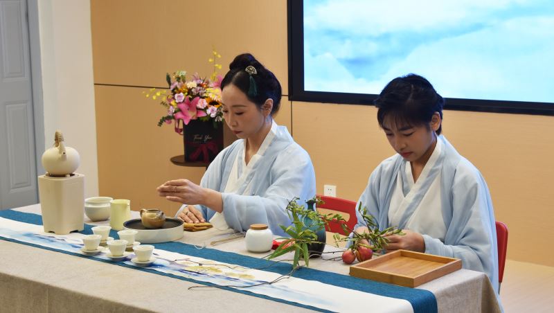 随后刘洋老师携初二年级李依轩、王紫凝、王子晨三名学生一同展示了 茶艺表演《兰亭序》。