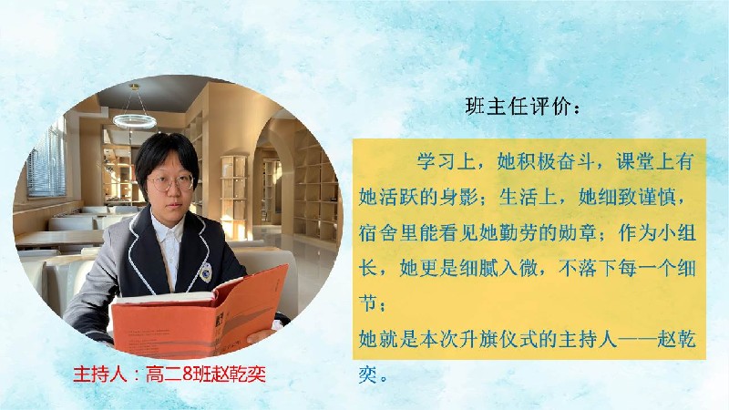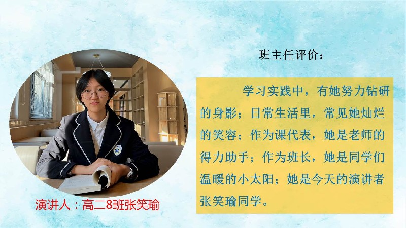 红日初升,其道大光;群英荟萃,济济一堂,壮哉斯八班之学子,文运昌隆,承蒙良师之训导,直登魁榜。上承千载悠悠文化,通乎古今之变;下载浩浩革命炬火,合于时代新征,幸哉矣,生乎今日之中华,运哉矣,学于二西,当存以鸿鹄之志,乘长风于万里,于斯青春韶华,谱璨璨之华章。