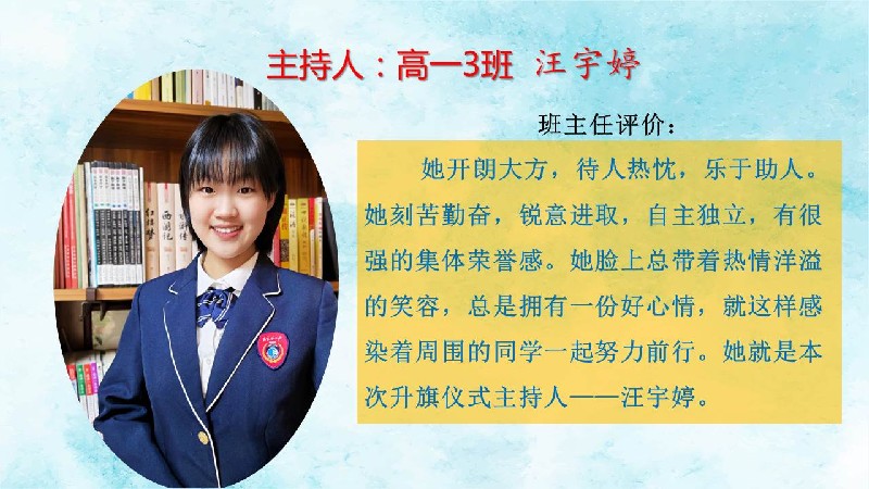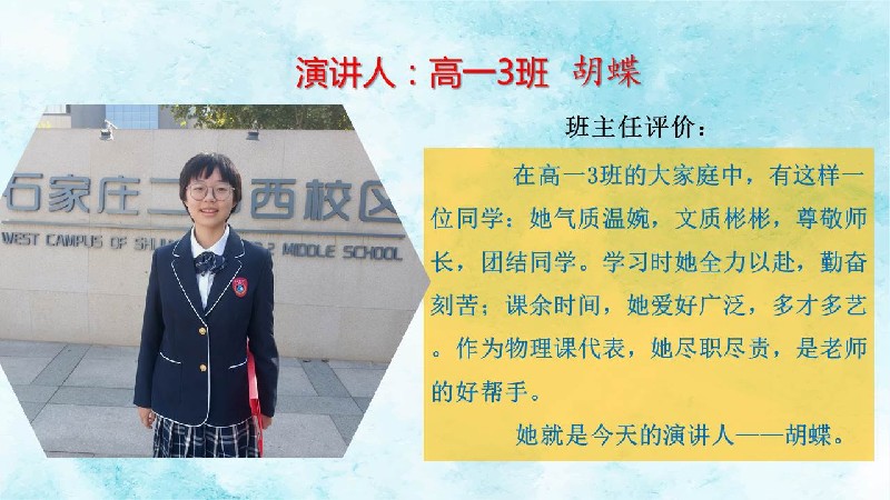 大家上午好!我是高一3班的胡蝶。今天我演讲的题目是“与信仰对话 为青春导航”。