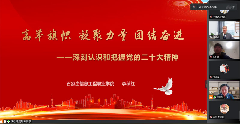 为深入学习贯彻党的二十大精神,12月14日,二中西校区邀请市委“走基层”校园宣讲团成员、石家庄信息工程职业学院马克思学院副院长李秋红教授为师生做了一场线上宣讲报告会。全体教工和学生代表共计290余人聆听了此次报告,报告会由孙福山校长主持。